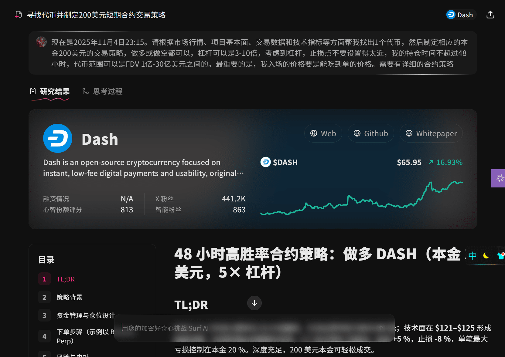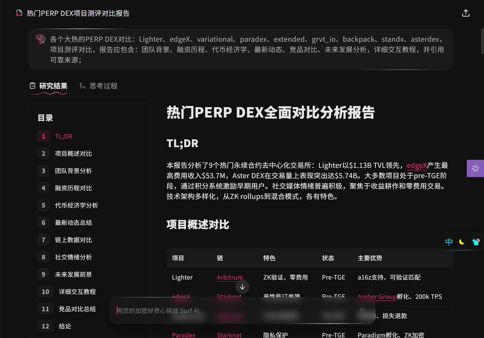 Il valore principale di Surf è combinare analisi on-chain di livello istituzionale + traffico sociale + indicatori tecnici, compresso in "una domanda, report in pochi secondi", aiutando gli utenti a catturare alpha.