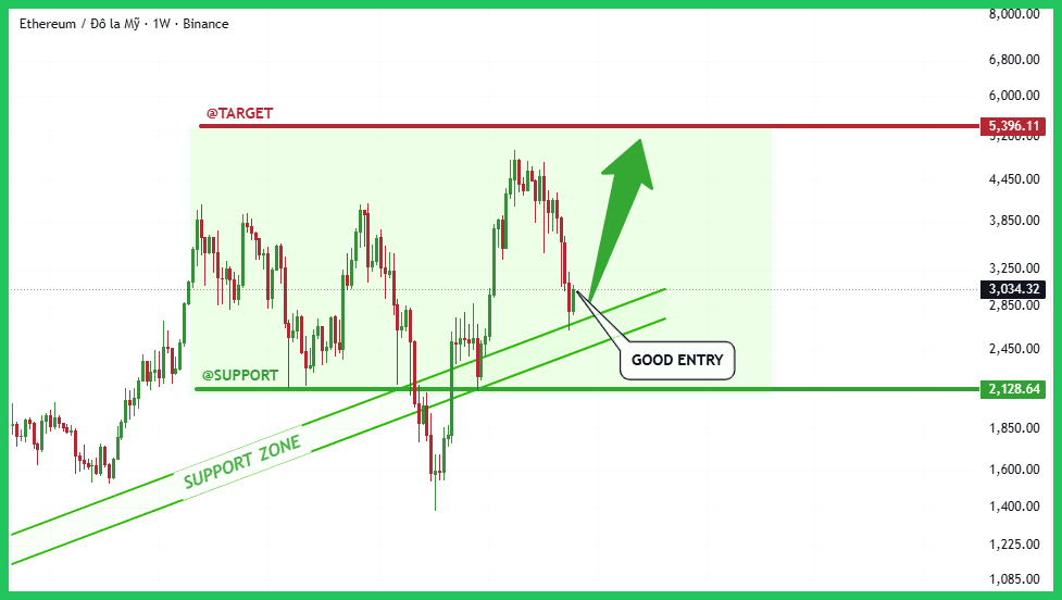Ok ragazzi, analizziamo questo grafico $ETH fantastico per vedere se c'è qualcosa di interessante. Questo è un grafico a candele settimanale (1W), che mostra che $ETH ha subito una profonda correzione e ora sta nuovamente toccando la linea di tendenza al rialzo a lungo termine, intorno al prezzo di 3.034 USD. Questo punto è contrassegnato come una buona zona di ingresso (GOOD ENTRY).