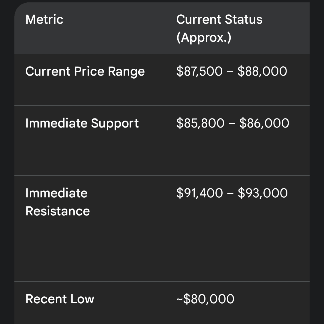 | Intervallo di Prezzo Attuale | $87,500 – $88,000 | Consolidamento dopo un forte calo. |