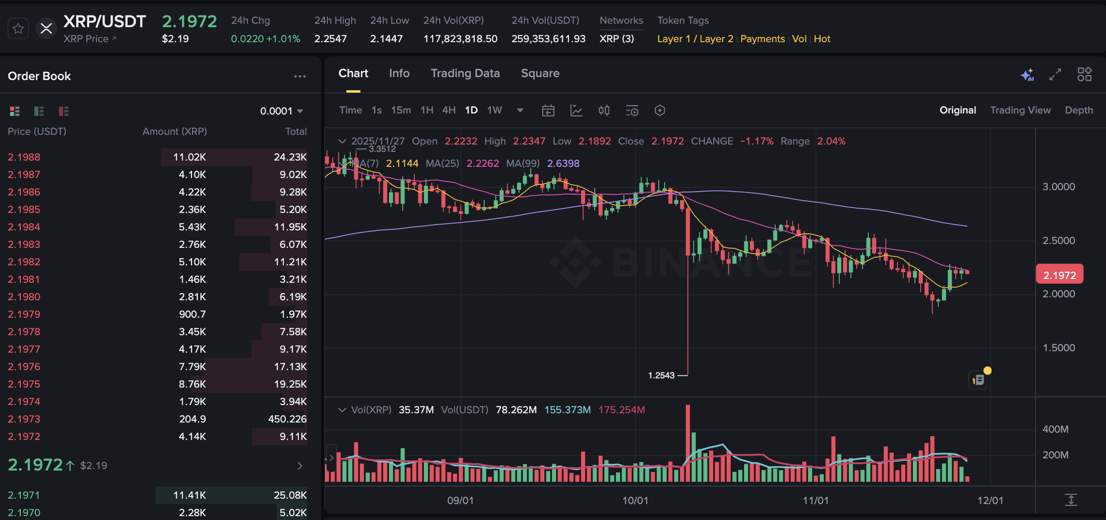 Secondo il rapporto presentato, XRP mostra un movimento di salita graduale, ma la domanda per i fondi negoziati in borsa non si è ancora tradotta in uno slancio forte nel prezzo. Il token si stabilizza attualmente a un livello compreso tra 2.17 e 2.21 dollari USA, con il livello di resistenza principale fermo a 2.24 e 2.38 dollari USA.