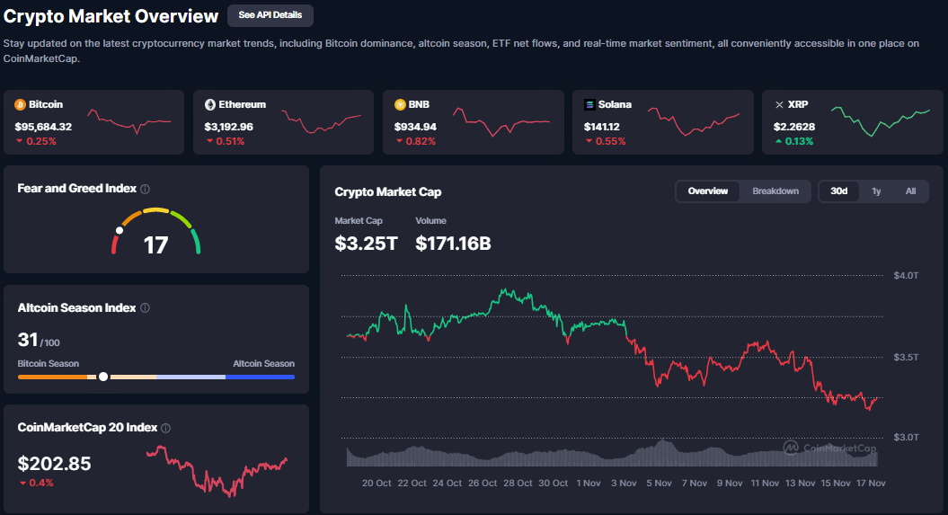 L'indice di paura e avidità crypto è sceso a livelli di paura estrema. | fonte: CoinMarketCap