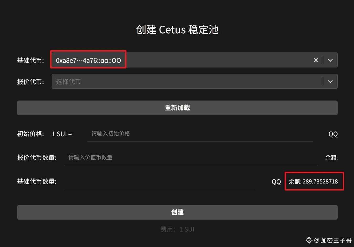 选择基础代币后,下面会显示基础代币的余额。