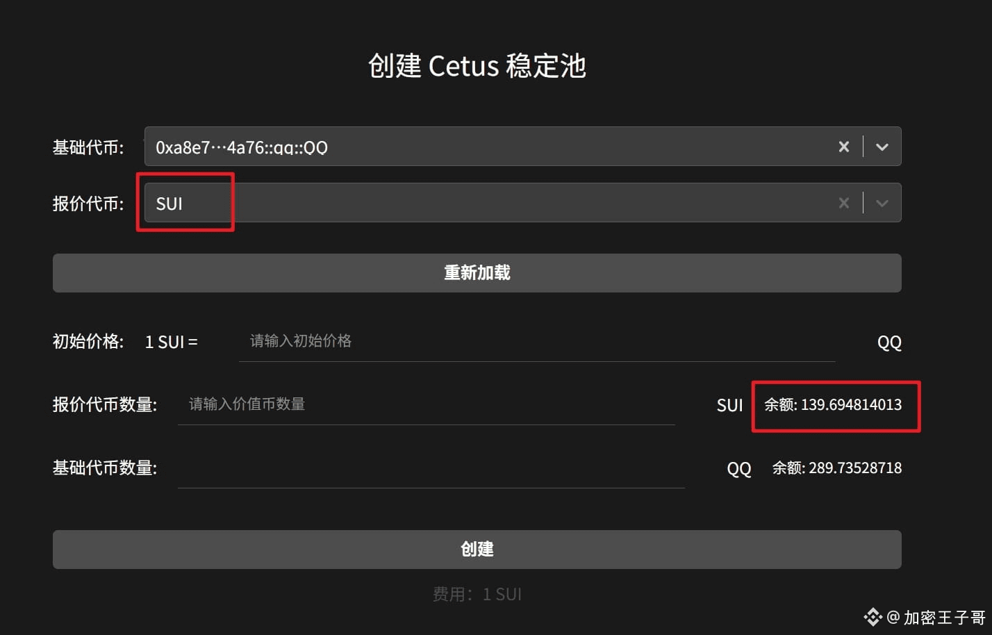 选择报价代币后,下面会显示报价代币的余额。