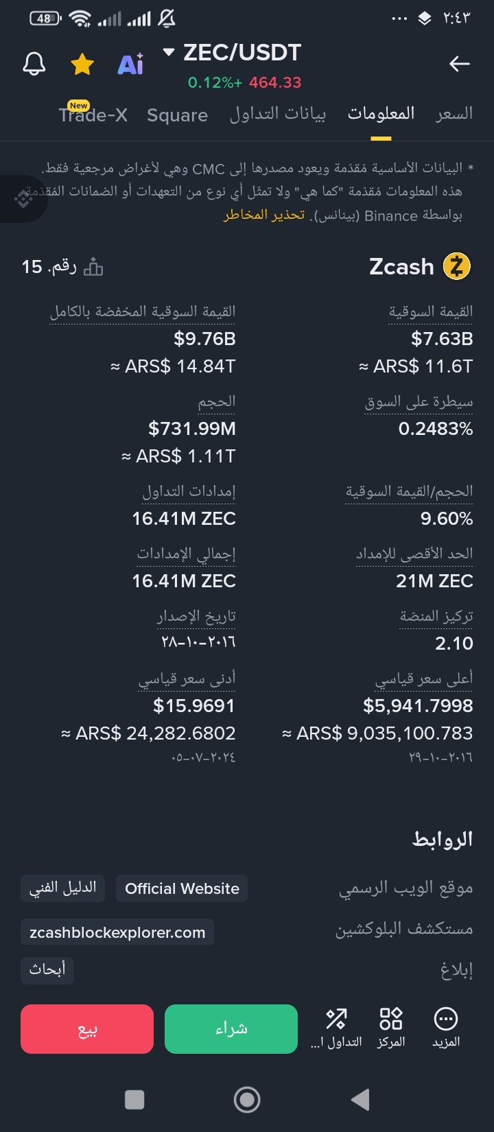 Coppia: ZEC/USDT — prezzo attuale ~464–465.