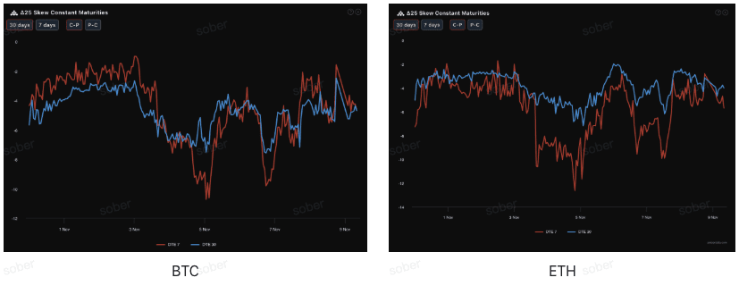 Valori negativi cronici: il skew a 25Delta di BTC e ETH rimane costantemente in territorio negativo, indicando che la domanda di opzioni put supera quella di opzioni call, con il mercato che continua a proteggersi da rischi di ribasso di coda. Rispetto al passato, l'ampiezza del valore negativo del skew si è ridotta, riflettendo una diminuzione del premio per le opzioni put e un lieve miglioramento dell'ansia a breve termine, coerente con il miglioramento dell'umore macroeconomico.