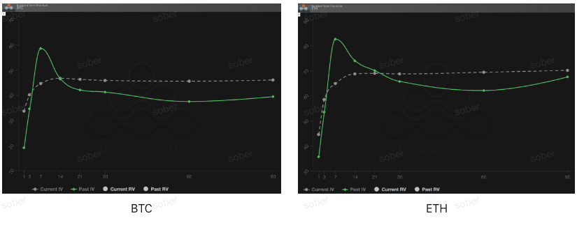Dalla struttura temporale, la settimana scorsa la curva della volatilità implicita di BTC e ETH non presentava la forma tipica di Contango (bassa vicino, alta lontano), ma un'architettura a 'dome' con un significativo rialzo dell'IV a breve termine e un livello elevato a lungo termine.