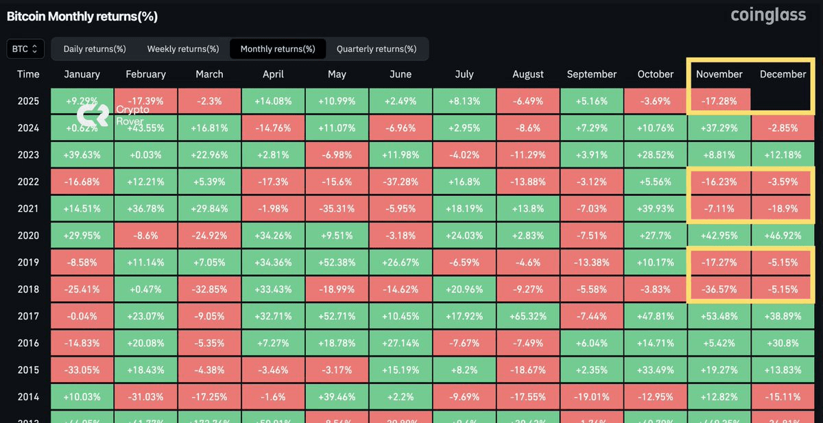 I dati di Coinglass mostrano che novembre 2025 si è chiuso con un drastico -17.28%, rendendolo uno dei peggiori novembre per Bitcoin negli ultimi sette anni.