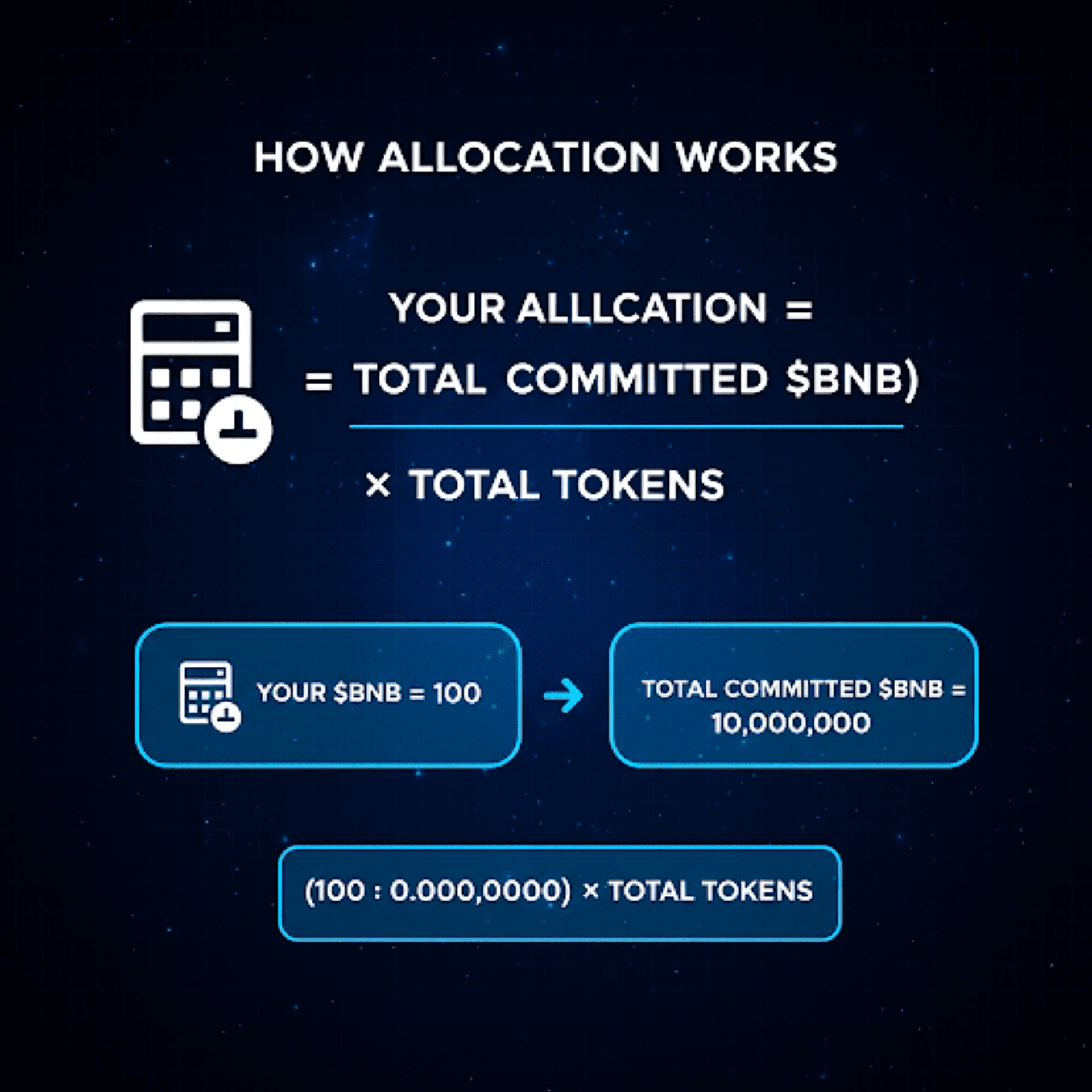 ✅ Formula di allocazione – La tua quota = (Il tuo $BNB / Totale $BNB impegnato) × Totale Token