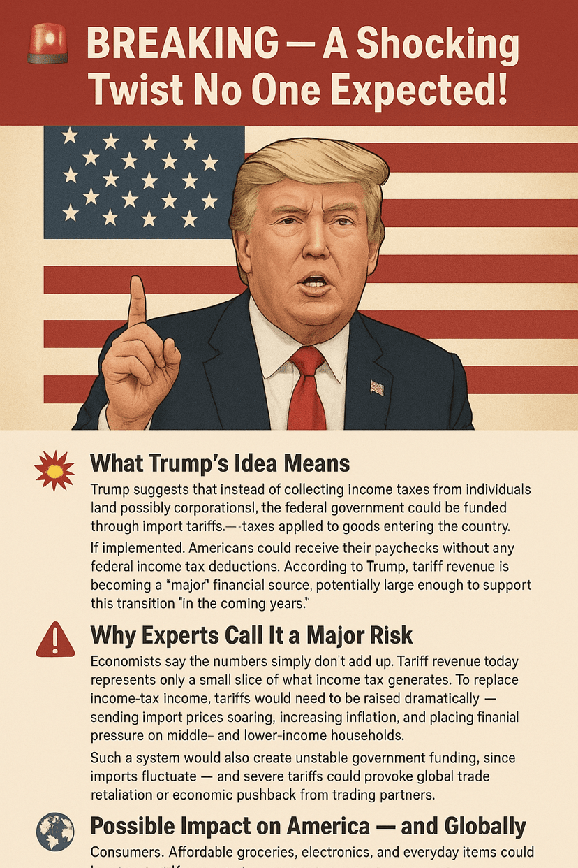 Donald Trump ha mandato in frenesia sia i mercati globali che gli analisti politici dopo aver accennato a una drammatica riforma economica: eliminare completamente l'imposta sul reddito negli Stati Uniti e gestire il governo esclusivamente con le entrate delle tariffe. 🇺🇸🔥 Questo sarebbe uno dei cambiamenti economici più ampi e non convenzionali proposti nella storia moderna.