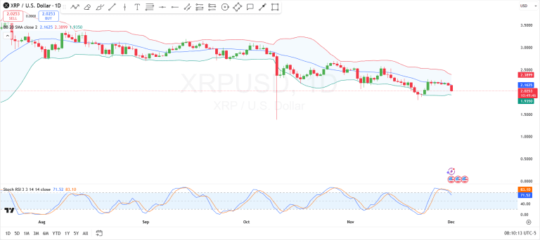 Guardando l'aspetto tecnico, XRP continua a scambiare al di sotto della banda centrale di Bollinger. La banda superiore si trova attualmente vicino a $2.38, formando una zona di resistenza immediata dove i precedenti tentativi di rialzo si sono già arrestati. La linea mediana, posizionata intorno a $2.16, ora funge da barriera dinamica più vicina, e il prezzo ha fallito nel riconquistarla da quando è scivolato al di sotto di questo livello.