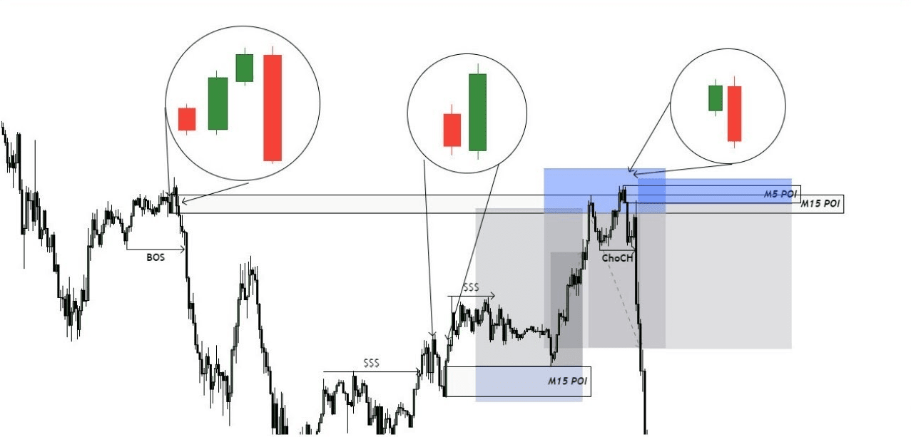 Rottura di Struttura (BOS): Mostra la nuova direzione della tendenza.