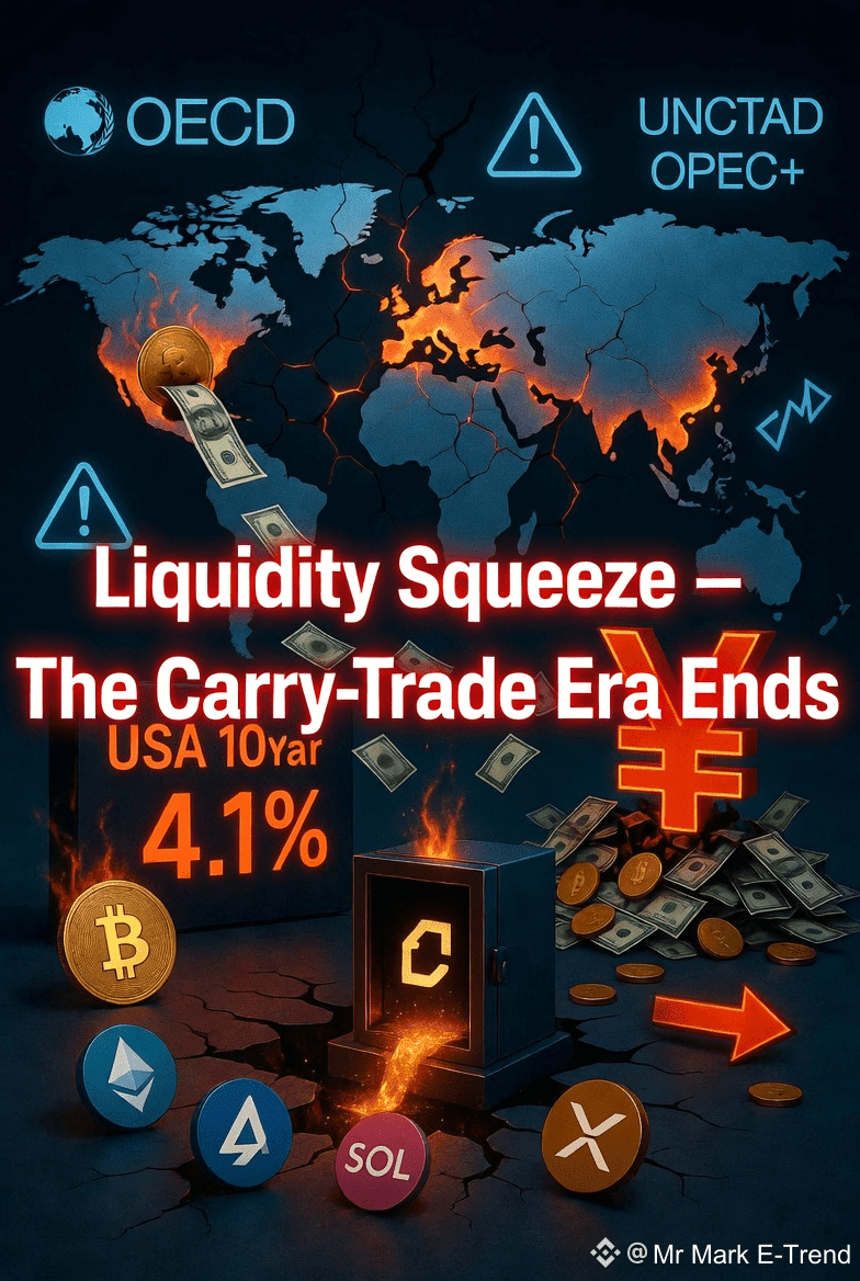 • BOJ goes hawkish — the yen surges over +2% after signals of a possible December rate hike. The historic yen carry-trade — a major liquidity engine for risk assets — collapses. Flows dry up.