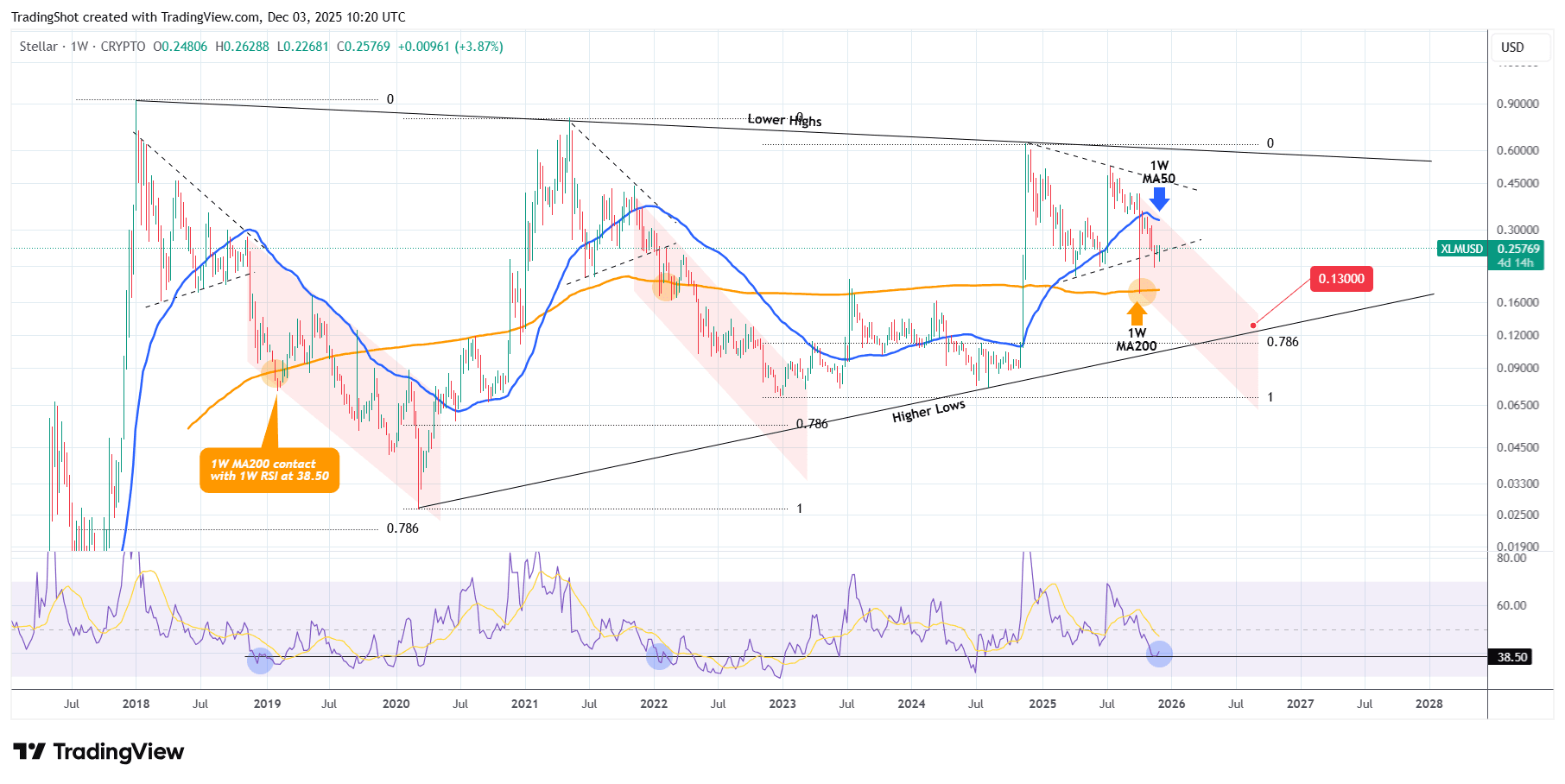 Di conseguenza stimiamo che questo ciclo ribassista potrebbe toccare il fondo intorno a 0.13000 prima che XLM diventi di nuovo un'opportunità di acquisto a lungo termine.