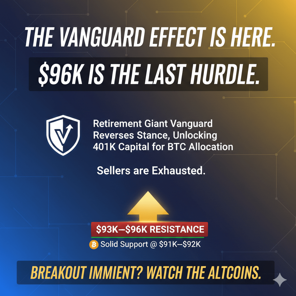 #VanguardCrypto #401K L'unico vero ostacolo è che BTC deve superare l'intervallo 93K-96K. La buona notizia è che sta costruendo un solido supporto intorno a 91K-92K. Se BTC riesce a sfondare, le altcoin dovrebbero aumentare insieme ad esso.