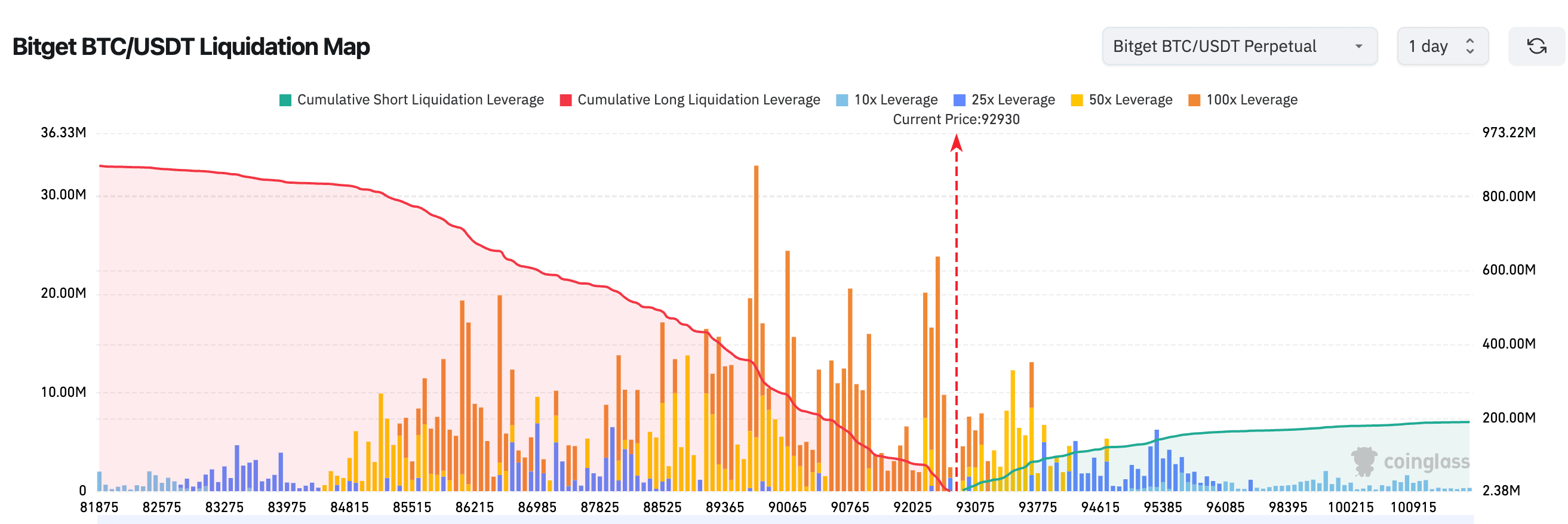 3、La mappa di liquidazione BTC/USDT mostra cluster densi di posizioni lunghe ad alta leva (50–100x) tra 89.000 e 92.000 dollari sotto il prezzo attuale (~92.930 dollari). Un ritracciamento potrebbe innescare liquidazioni lunghe a cascata. La pressione dalla parte corta è più leggera sopra, con leva corta principalmente concentrata sopra 94.000 dollari, implicando una resistenza più debole a una rottura al rialzo.
