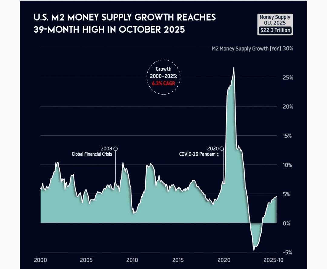 L'offerta di moneta M2 negli Stati Uniti è cresciuta del 4,6% su base annua nell'ottobre 2025, raggiungendo 22,3 trilioni di dollari—il ritmo più veloce da luglio 2022. Pur rimanendo al di sotto del tasso di crescita medio a lungo termine del 6,3% (2000–2025) e del ritmo combinato del 5,1% della crescita del PIL reale (2,1% nel secondo trimestre del 2025) e dell'inflazione (3,0% a settembre 2025), il rimbalzo segna un cambiamento dalla stretta monetaria post-pandemia verso una nuova espansione. Questo aumento sostenuto della liquidità sta attirando l'attenzione su potenziali pressioni inflazionistiche, l'evoluzione delle condizioni di credito e la direzione di un più ampio slancio economico.