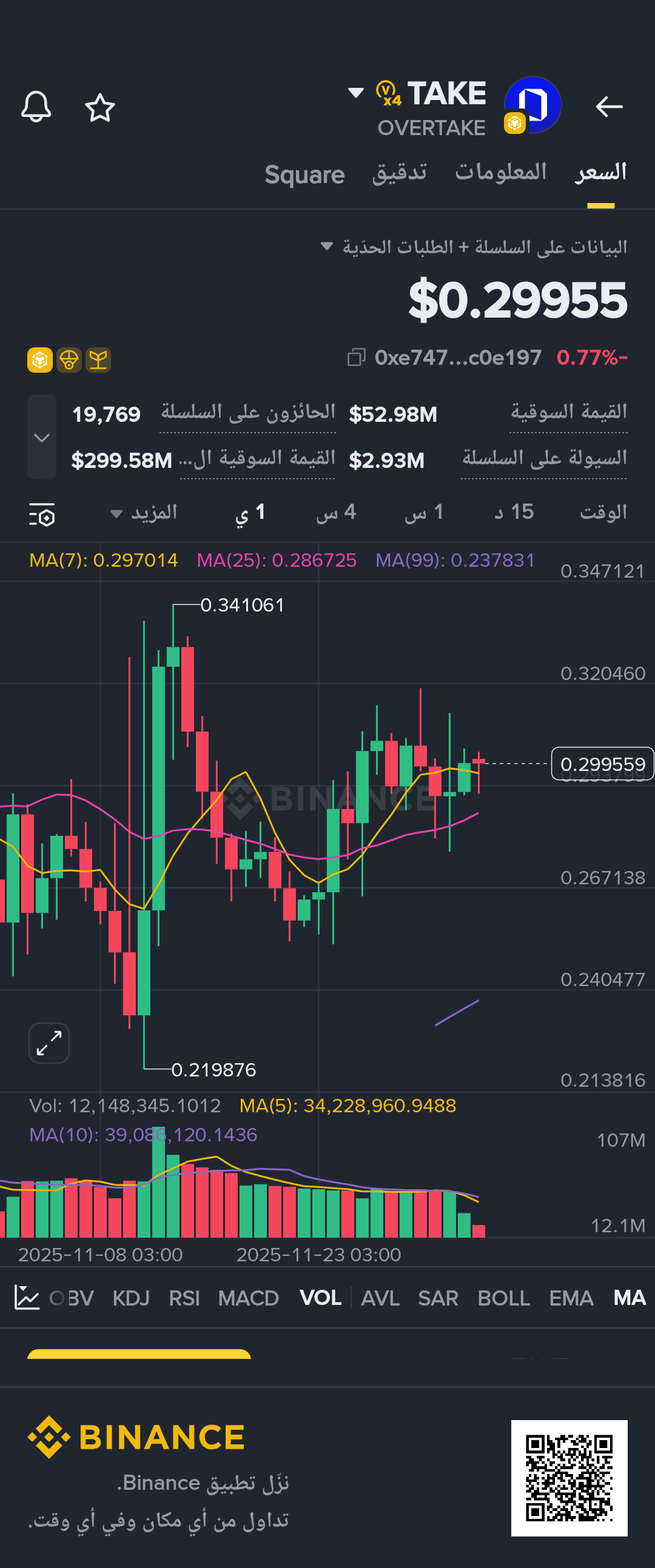 Tendenza generale: Poiché il prezzo attuale ($0.29955) è significativamente superiore alle medie mobili a lungo termine (MA(25) e MA(99)), la tendenza generale a medio e lungo termine può essere considerata rialzista (Bullish).