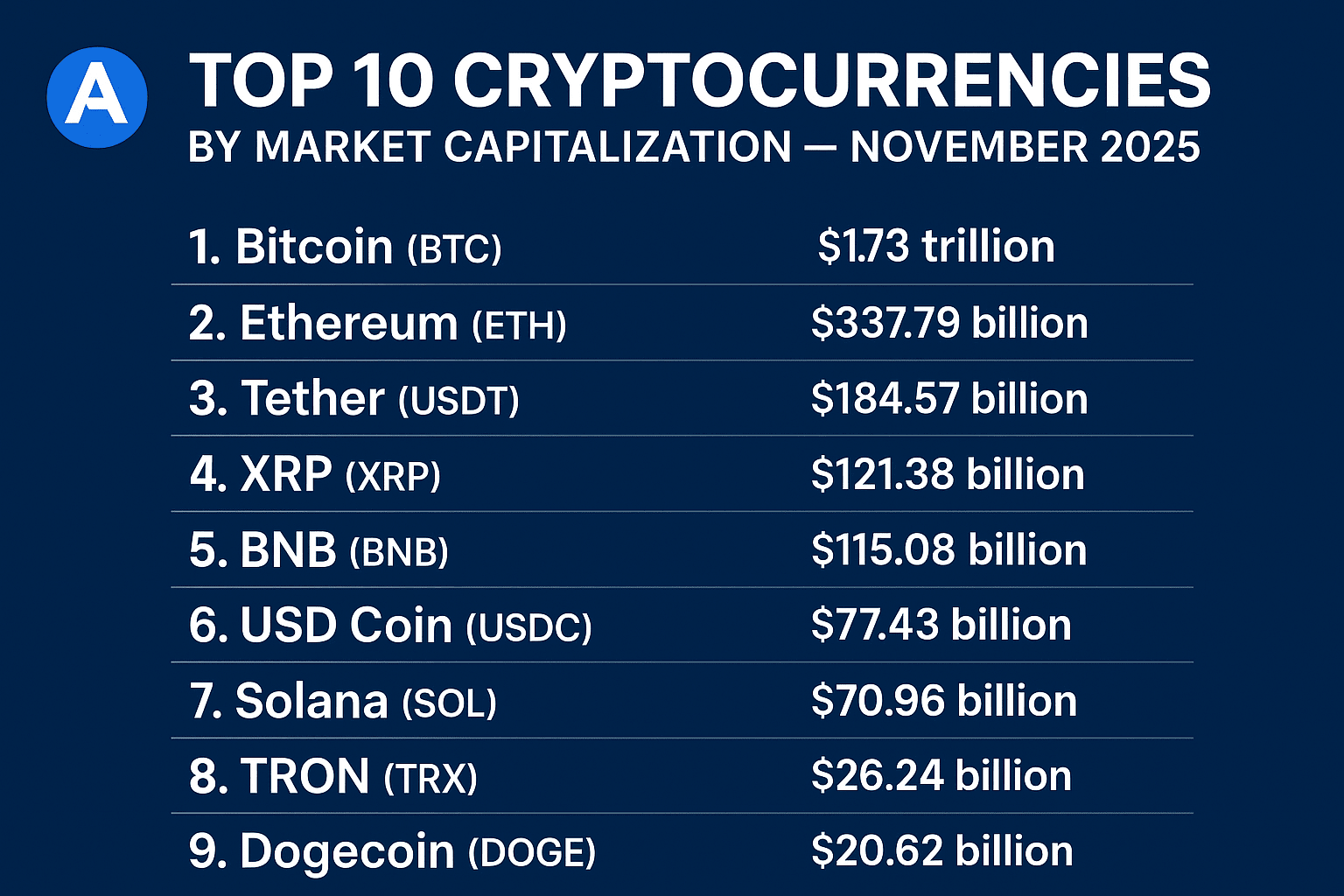Il mercato delle criptovalute continua a evolversi rapidamente, con i principali asset che rafforzano le loro posizioni man mano che l'adozione si espande. Di seguito è riportato un'istantanea delle prime 10 criptovalute per capitalizzazione di mercato a novembre 2025.