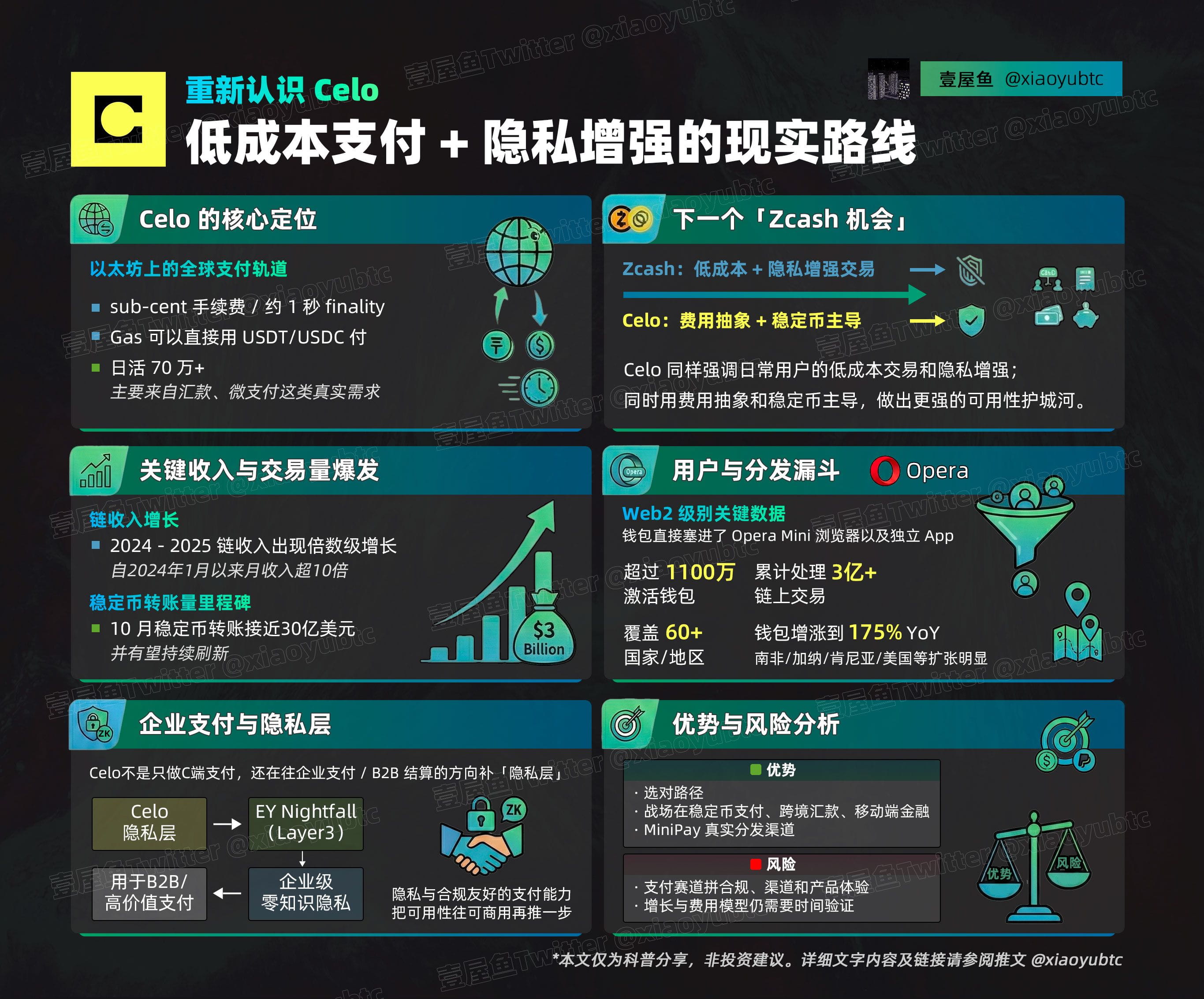2. Celo utilizza l'astrazione dei costi e le stablecoin per creare un fossato di usabilità più forte, un po' come l'adozione protetta di ZCash, ma con scenari più ampi.