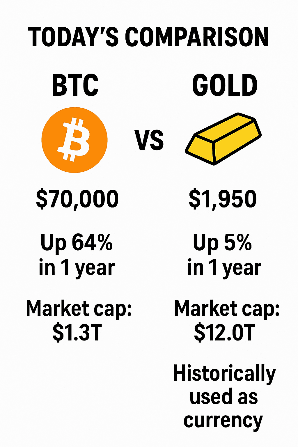L'oro cresce lentamente ma protegge la tua ricchezza in ogni stagione dell'economia. Bitcoin si muove velocemente con alte ricompense. L'oro è il vecchio scudo fidato del valore attraverso i secoli.