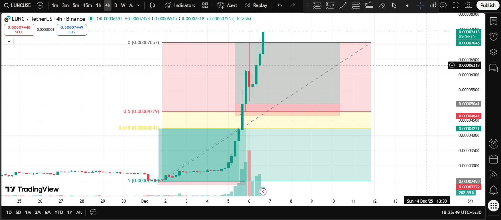 Disegna Fibonacci dal top 0.00007557 → fondo 0.00002500.