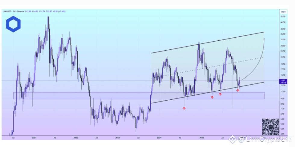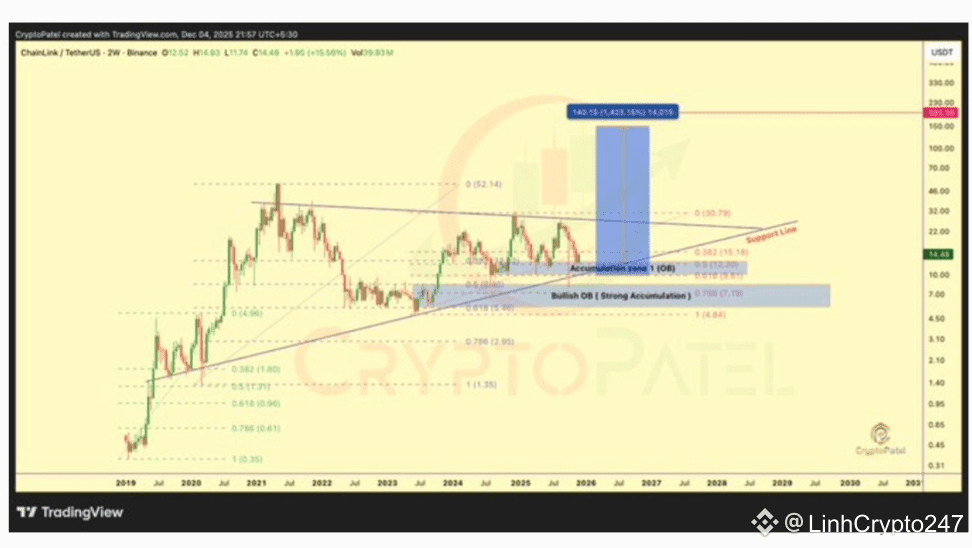 Secondo l'analista di mercato Crypto Patel, Chainlink ha formato una struttura di accumulo a lungo termine dal 2020. Nonostante i recenti ritracciamenti, il trend macro rimane intatto.