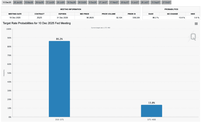 Secondo i dati più recenti di CME Group FedWatch, il mercato prevede ora un'86% di probabilità che la Fed effettui il terzo taglio dei tassi dell'anno il 10 dicembre, in linea con le aspettative della scorsa settimana, quasi confermando l'imminente riduzione dei tassi. Questa certezza ha calmato le fluttuazioni a breve termine del mercato che erano emerse a causa dell'incertezza sulle prospettive di riduzione dei tassi.