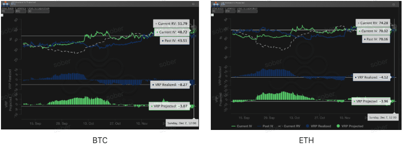 Questa settimana, la volatilità RV è diminuita, facendo sì che l'ampiezza negativa del VRP si restringesse leggermente. Tuttavia, la struttura di profonda negatività del VRP non è cambiata, con il Realized VRP e il Projected VRP entrambi ancora negativi.