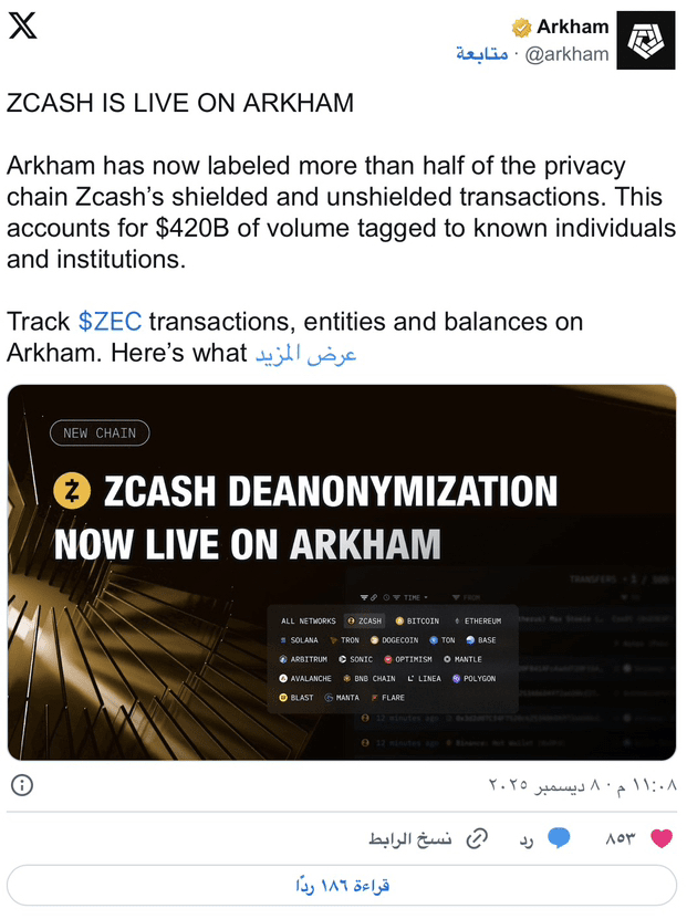Zcash ha costruito la sua reputazione su transazioni protette. Per anni, si è presentato come uno dei più potenti strumenti di privacy nel mondo delle criptovalute. L'annuncio di Arkham mette questa immagine alla prova pubblicamente. Per chiarire, non tutte le attività di Zcash sono state rivelate. Gli indirizzi protetti continuano a nascondere i dettagli delle transazioni a livello di protocollo. Ma Arkham afferma che l'uso reale nel mondo concreto indebolisce quella protezione quando gli utenti interagiscono con piattaforme di trading o entità riconosciute.