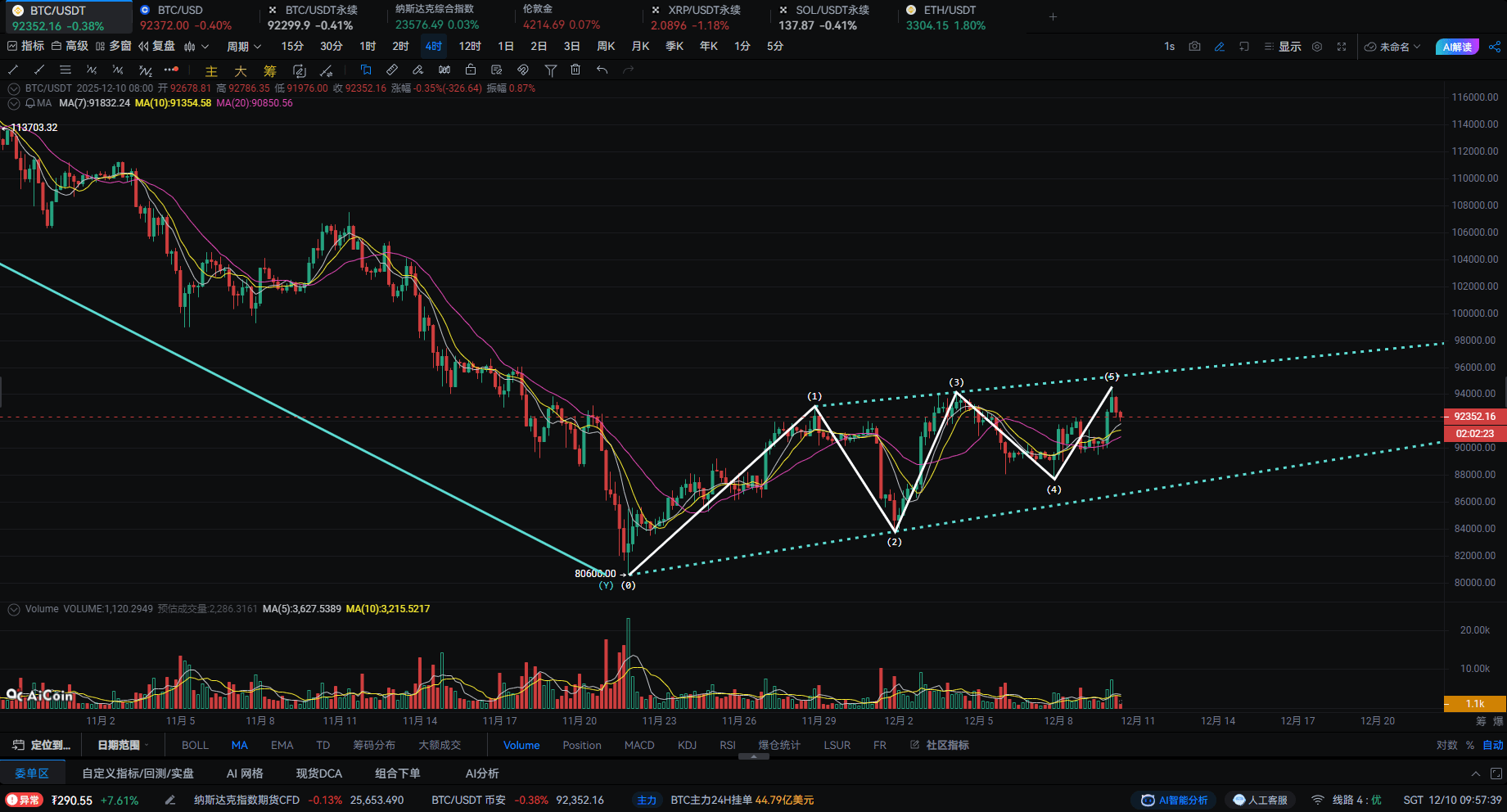 Dalla panoramica si può vedere che il Bitcoin attualmente opera vicino alla linea centrale di un canale inclinato verso l'alto, con il prezzo che ha ricevuto supporto più volte lungo il bordo inferiore del canale e ha formato minimi più alti dopo ogni discesa (la posizione della seconda onda e della quarta onda è molto critica). Ciò indica che la struttura complessiva dei rialzisti rimane solida e la linea di tendenza non è stata compromessa.