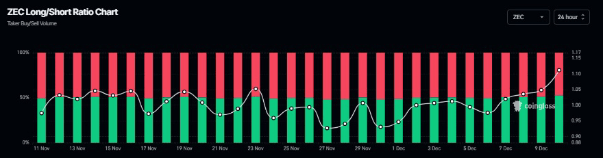 Inoltre, il rapporto acquisto/vendita di $ZEC di CoinGlass legge 1,08, il livello più alto del mese. Un rapporto sopra uno indica che più trader scommettono su un aumento del prezzo di Zcash.