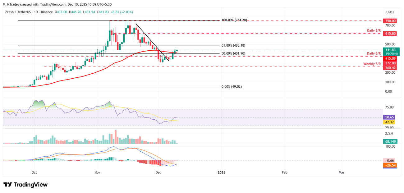 Il prezzo ha rotto $ZEC sopra la linea di tendenza discendente (tracciata collegando diversi massimi dal 20 novembre) il 5 dicembre. Tuttavia, non è riuscito a mantenere lo slancio rialzista ed è sceso il giorno successivo, trovando supporto attorno alla linea di tendenza. Lunedì, all'inizio della settimana, ZEC è aumentato di oltre il 19% e ha continuato a salire fino a martedì. Al momento della scrittura di questo rapporto mercoledì, ZEC continua a guadagnare, scambiandosi a oltre 440 dollari.