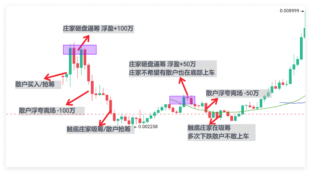 Dopo che la candela ha toccato il fondo per la prima volta, il progetto ha visto che la maggior parte degli investitori al dettaglio ha già capitolato. Continuare a pulire non ha alcun significato, a questo punto si verifica un primo rimbalzo. Certamente, in questo rimbalzo ci saranno molti investitori al dettaglio che parteciperanno, ma il progetto non può permettere agli investitori al dettaglio di spartirsi la propria torta. Dopo il rimbalzo, continuerà a scendere (guadagnando un'altra volta) finché non ci sarà paura tra gli investitori al dettaglio di entrare nel mercato. E se ci sono sempre investitori al dettaglio che cercano di ottenere chip, che si fa? Si abbandona il mercato!