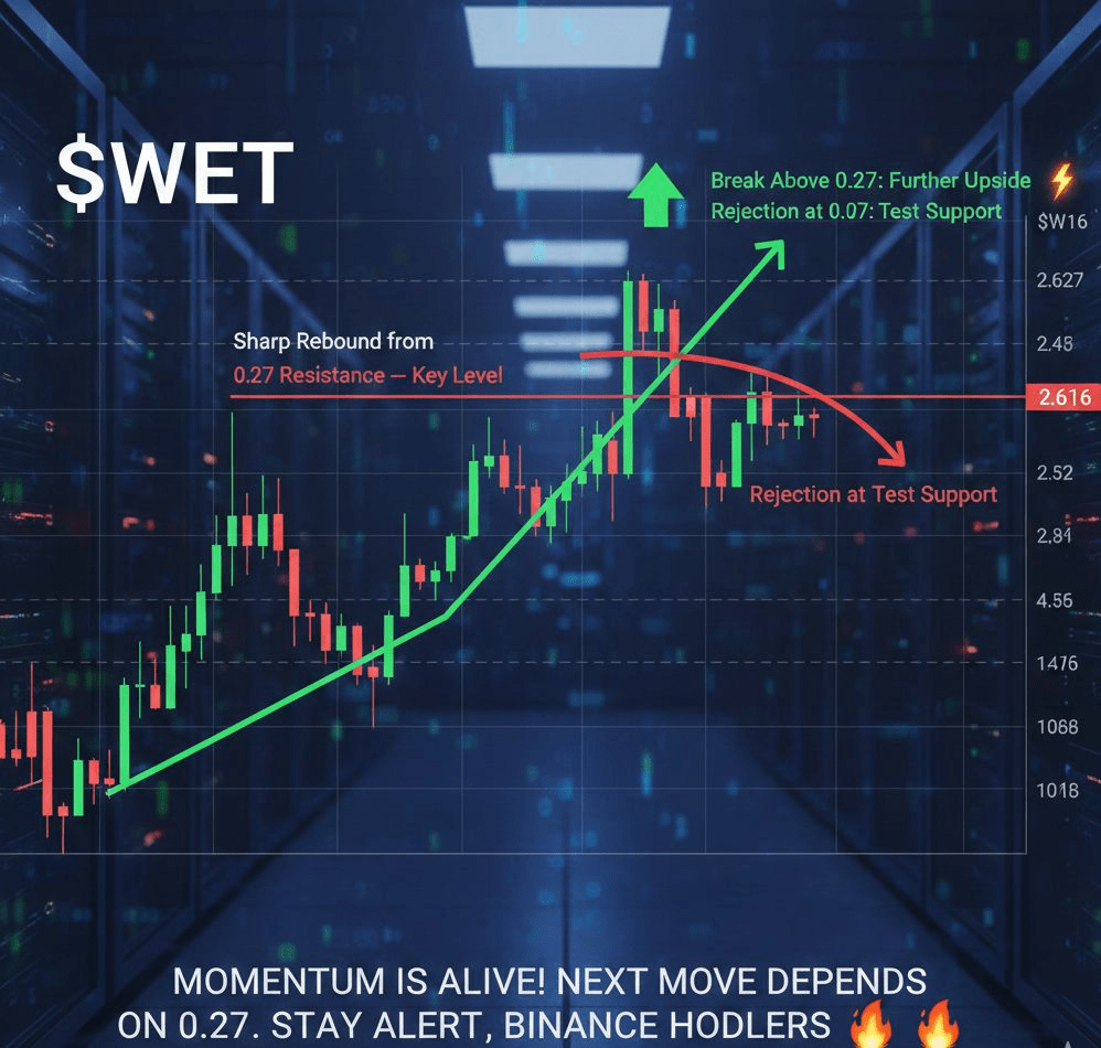 $WET ha mostrato un forte momentum, attualmente mantenendosi vicino a 0.2616 dopo un forte rimbalzo dalla zona di supporto a 0.2420. La forza degli acquirenti è entrata con decisione, spingendo il prezzo verso l'alto con convinzione.