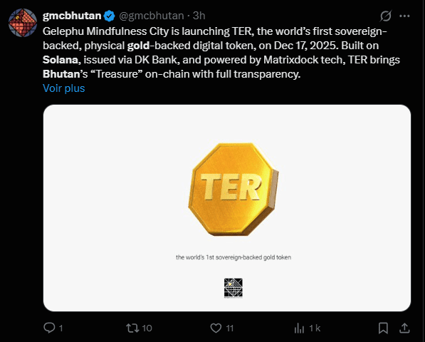 Il 12 dicembre, le autoritĂ della Gelephu Mindfulness City, una regione amministrativa speciale del Bhutan, hanno annunciato sulla stampa specializzata il lancio di TER, un token garantito da oro.