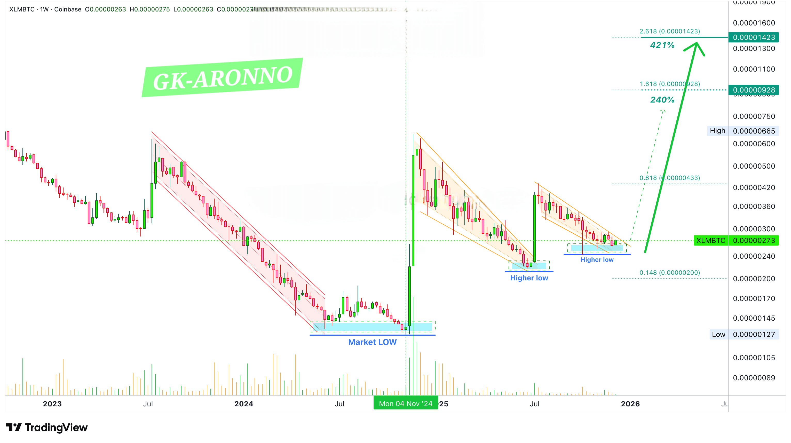 Dopo il minimo storico all'inizio di novembre 2024, XLMBTC ha prodotto il volume più alto in una settimana dopo quasi quattro anni. Questo è stato seguito da una crescita totale del 400% e tutto il lavoro ribassista risultante ha portato a massimi più alti, rivelando un mercato rialzista. Dopo un anno intero di lavoro ribassista all'interno di una struttura rialzista più ampia, il mercato è pronto per produrre un recupero, una continuità rialzista.