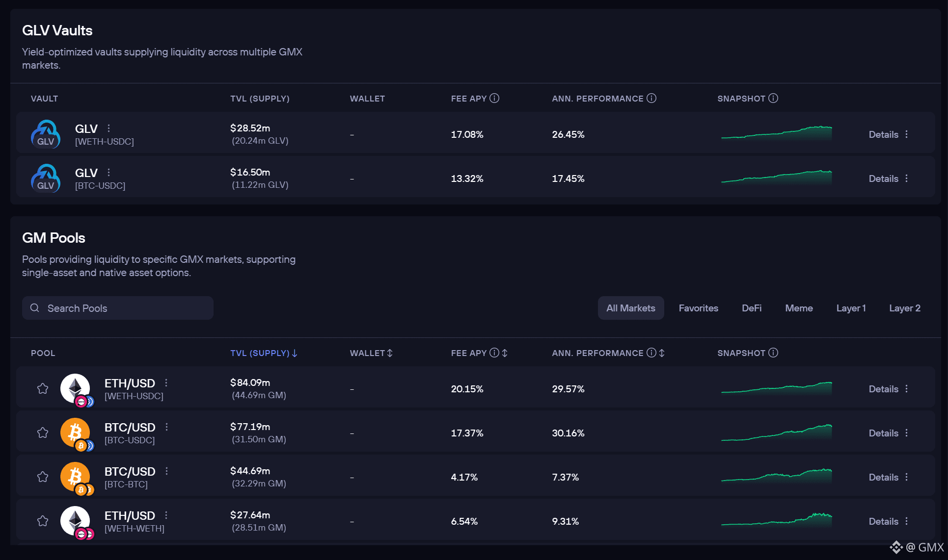 Your LP rewards auto-compound continuously, increasing the price of your GM or GLV tokens.