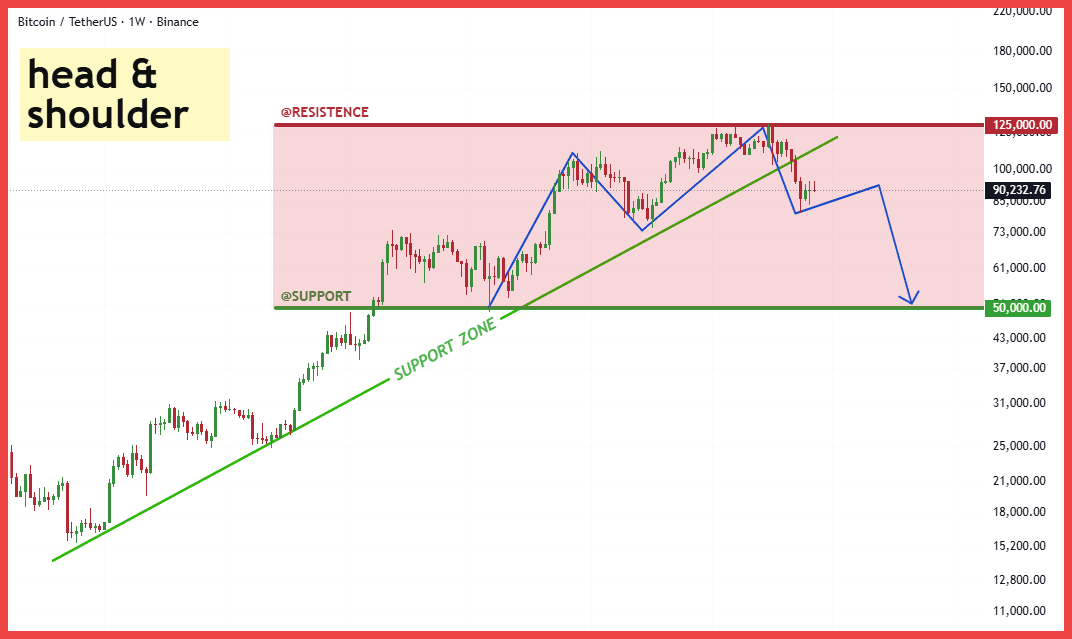 L'analisi tecnica mostra che dopo aver raggiunto il picco nella zona di Resistenza $125,000, $BTC ha formato un classico modello Testa e Spalle (H&S). Ancora più importante, il prezzo ha rotto (breakdown) la linea del collo verde, che era una linea di supporto per la tendenza rialzista a lungo termine. Attualmente, stiamo vedendo il prezzo tentare di risalire per ritestare questa linea, intorno al livello $90,000. Se $BTC non riesce a riprendere questa linea di supporto, il prossimo obiettivo ribassista sarà la zona di forte Supporto a $50,000. Questa è una zona di supporto psicologico e tecnico importante.