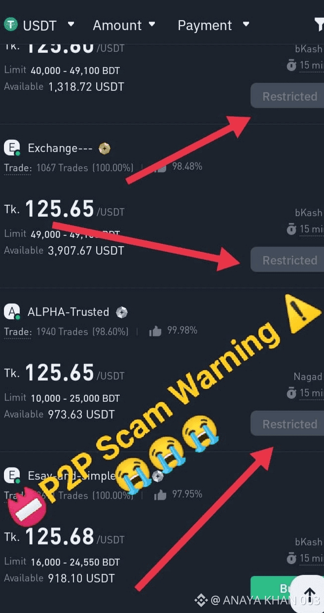 P2P Avviso di Truffa 🚫Ciao utenti di Binance, se fai trading su Binance P2P, queste informazioni sono molto importanti. Molte persone comprano o vendono USDT/USDC e ricevono pagamenti direttamente nei loro conti bancari — ma questo comporta dei rischi. Ecco cosa devi sapere:Truffa di Acquisto: Quando acquisti USDT/USDC, invii soldi dalla tua banca al venditore. Ma a volte il venditore può prendere il tuo pagamento e rifiutarsi di rilasciare la crypto.Non preoccuparti — puoi avviare un appello e, se la tua prova di pagamento è corretta, Binance restituirà i tuoi fondi.Alcuni venditori lo fanno di proposito, quindi rimani vigile.Truffa di Vendita: Quando vendi il tuo USDT, ti aspetti che l'acquirente invii soldi alla tua banca. I truffatori spesso cercano di utilizzare questo trucco:Non inviano i soldi, ma inviano un messaggio di pagamento falso per ingannarti.Non fidarti mai delle notifiche — controlla sempre manualmente il tuo conto bancario prima di rilasciare la tua crypto.Consigli Finali: Rimani calmo, fai attenzione e controlla due volte ogni passaggio. Questo è il modo migliore per evitare truffe P2P.Nota: Se ho commesso qualche errore, ti prego di scusarmi.Se vuoi imparare a fare trading P2P in modo sicuro, commenta “P2P” ⭐