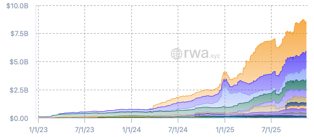 Gli attivi gestiti (AUM) sono cresciuti da 4 miliardi di dollari all'inizio del 2025 a 8,6 miliardi di dollari entro novembre, con un aumento del 110% (RWA.xyz)