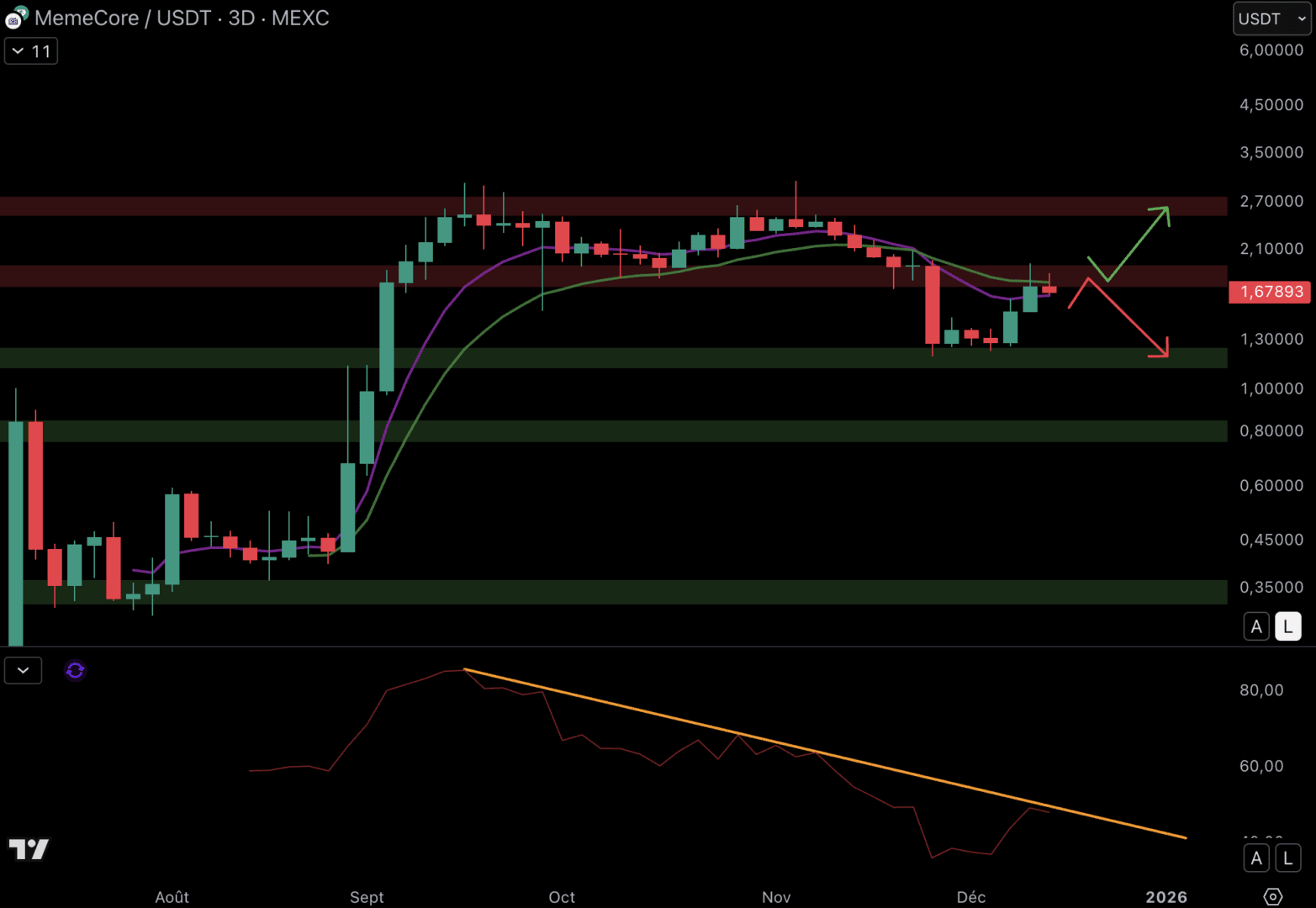 Il prezzo di M ha trovato acquirenti al livello del supporto a 1,2 $. Grazie al mantenimento del supporto, M ha rimbalzato al livello della resistenza a 1,8 $. Ma la dinamica di M è fragile in 3 giorni, e il prezzo deve affrontare la resistenza e le medie mobili (EMA 9/EMA 18) ribassiste: