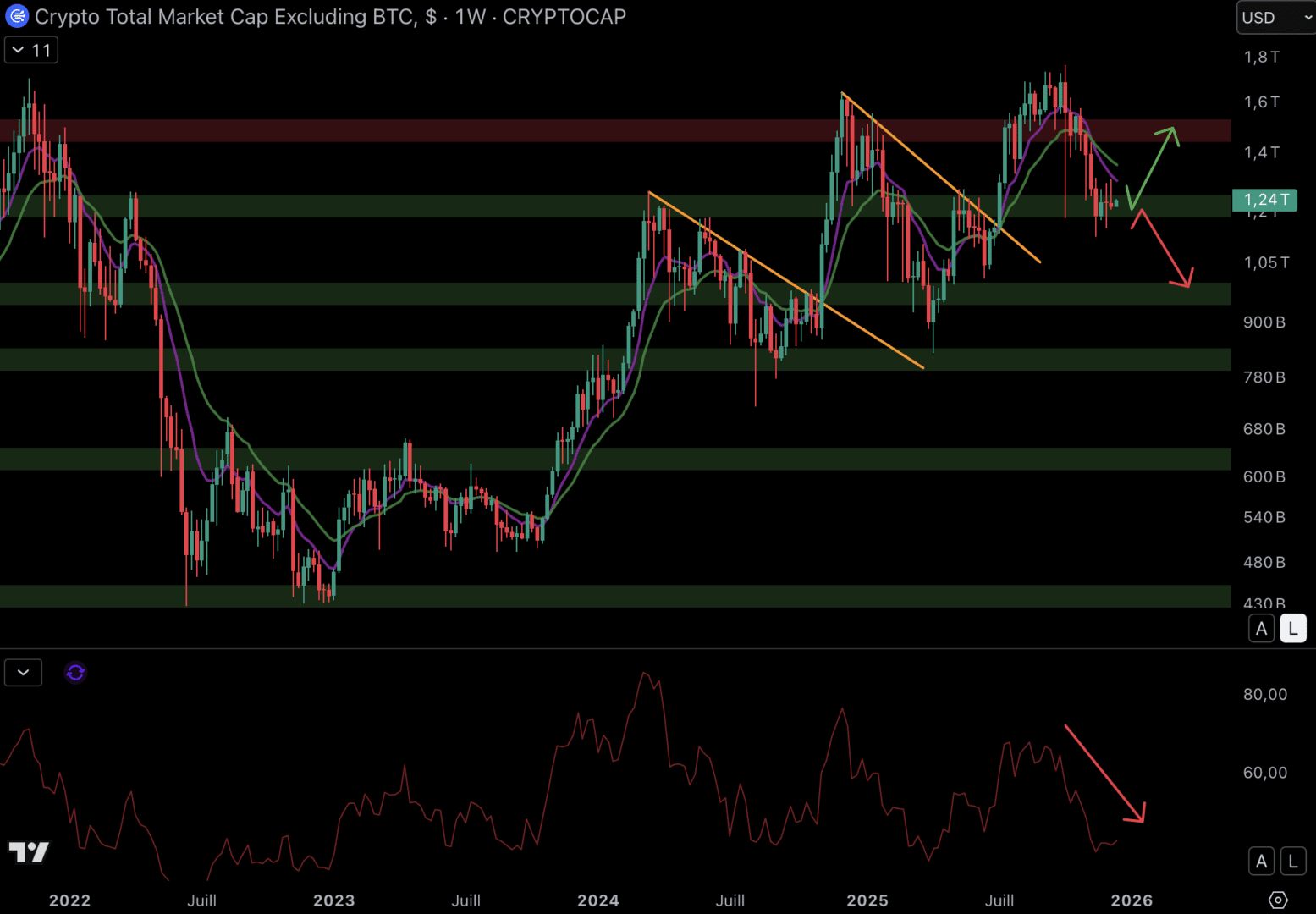 Il prezzo potrebbe bloccarsi tra le medie mobili (EMA 9/EMA 18) ribassiste. E se fosse così, la capitalizzazione delle altcoin potrebbe scendere verso il supporto a 980 miliardi di dollari. Ma se si forma un fondo attorno al supporto a 1 200 miliardi di dollari, un rimbalzo potrebbe riportare il prezzo al livello della resistenza a 1 500 miliardi di dollari. Dall'apice trovato a 1 800 miliardi di dollari, sono i venditori ad avere il controllo.