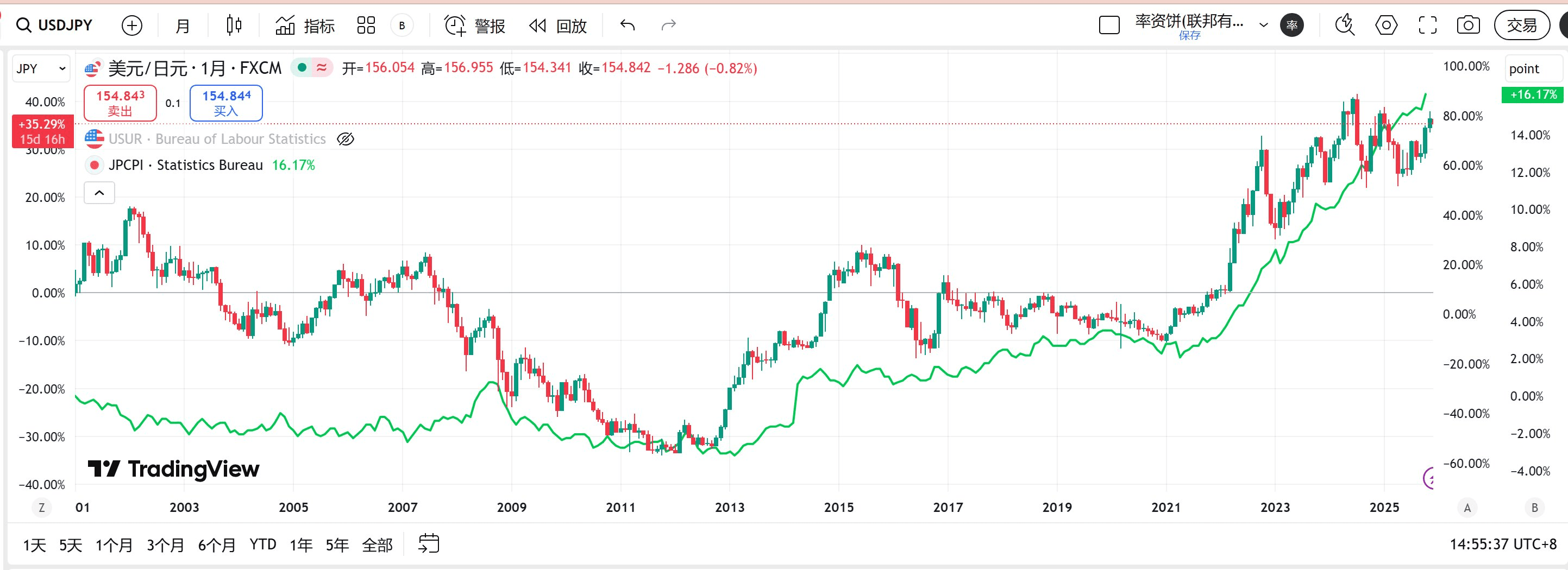 Il grafico illustra il tasso di cambio USD/JPY utilizzando candele, mentre la linea verde traccia l'indice dei prezzi al consumo (CPI) del Giappone, evidenziando la relazione tra i movimenti della valuta e le tendenze inflazionistiche domestiche.