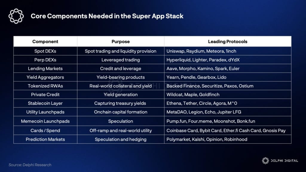 In questo rapporto, Crypto Superapp non è un'app gigante che fa tutto da sola, ma è un'app che seleziona i migliori protocolli (sistemi open-source) nel mercato e li unisce in un'unica posizione.