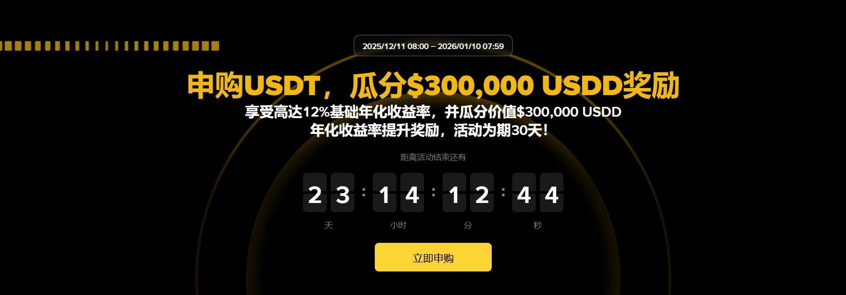 Partecipa alla gestione patrimoniale del portafoglio Binance nella strategia Yield+ USDD USDT, all'interno di 30 giorni puoi dividere un premio totale di 300.000 USDD.