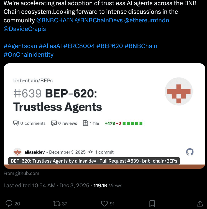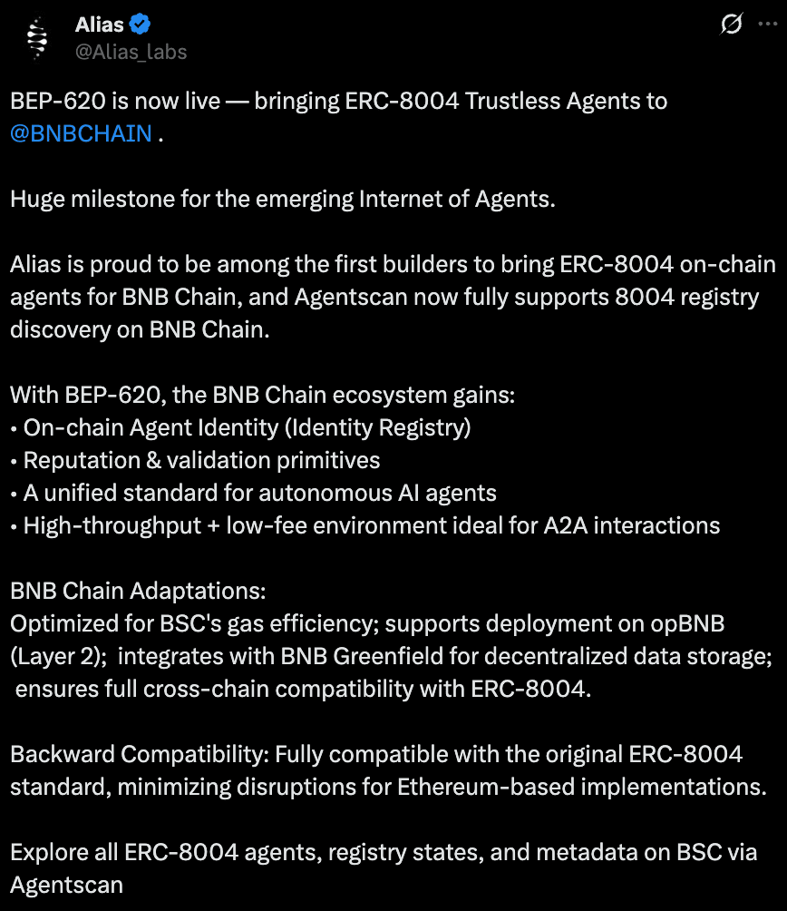 Il BEP-620 lancia lo standard degli agenti senza fiducia sulla BNB Smart Chain: il BEP-620 porta il modello degli “Agenti senza fiducia” ERC-8004 sulla BNB Smart Chain, definendo registri on-chain per l'identità, la reputazione e la validazione degli agenti. Questo getta le basi per agenti e servizi AI autonomi per costruire reputazioni verificabili direttamente sulla BNB Chain e su opBNB.
