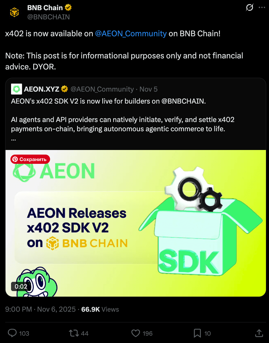 L'SDK V2 x402 di AEON è attivo per i pagamenti AI sulla BNB Chain: AEON ha rilasciato l'SDK V2 x402 sulla BNB Chain, consentendo ad agenti AI e fornitori di API di avviare, verificare e regolare i pagamenti nativamente on-chain utilizzando lo standard x402. Il rollout segue il superamento da parte di AEON di $29 milioni in volume di pagamenti AI elaborati, rafforzando il ruolo della BNB Chain nell'emergente economia agentica.