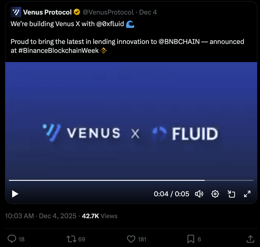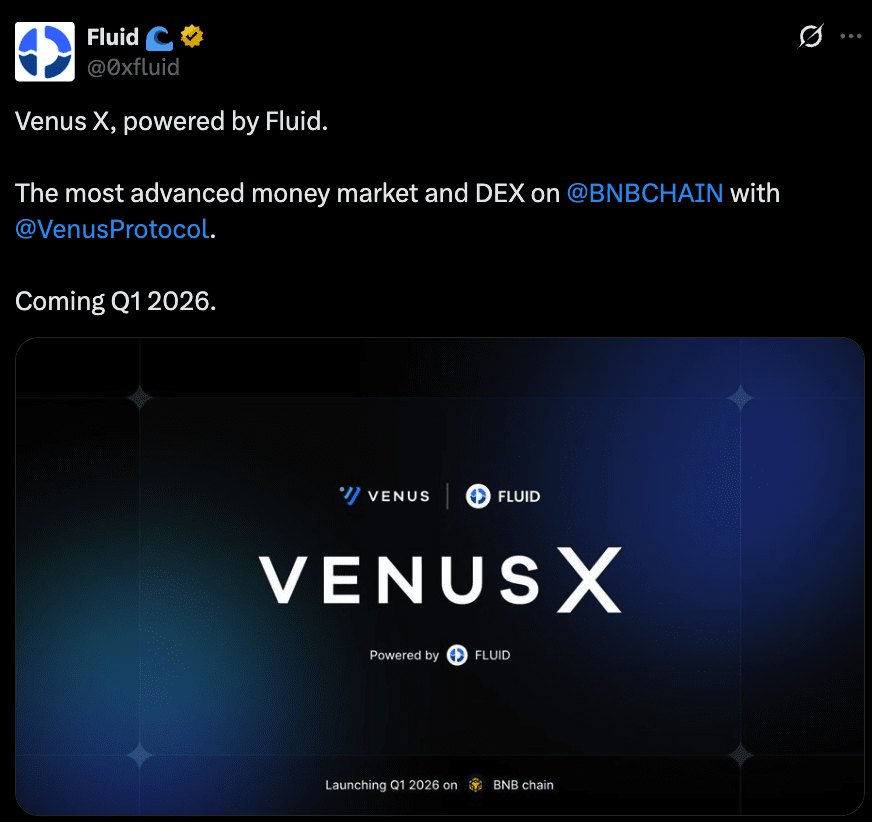 Venus X svelato come mercato monetario e DEX di nuova generazione sulla BNB Chain: durante la Binance Blockchain Week, Venus Protocol ha rivelato Venus X—un nuovo mercato monetario più un stack DEX alimentato da Fluid e distribuito sulla BNB Chain. L'aggiornamento mira a trasformare Venus in un hub DeFi più efficiente in termini di capitale e generatore di entrate in vista del lancio programmato per il Q1 2026.