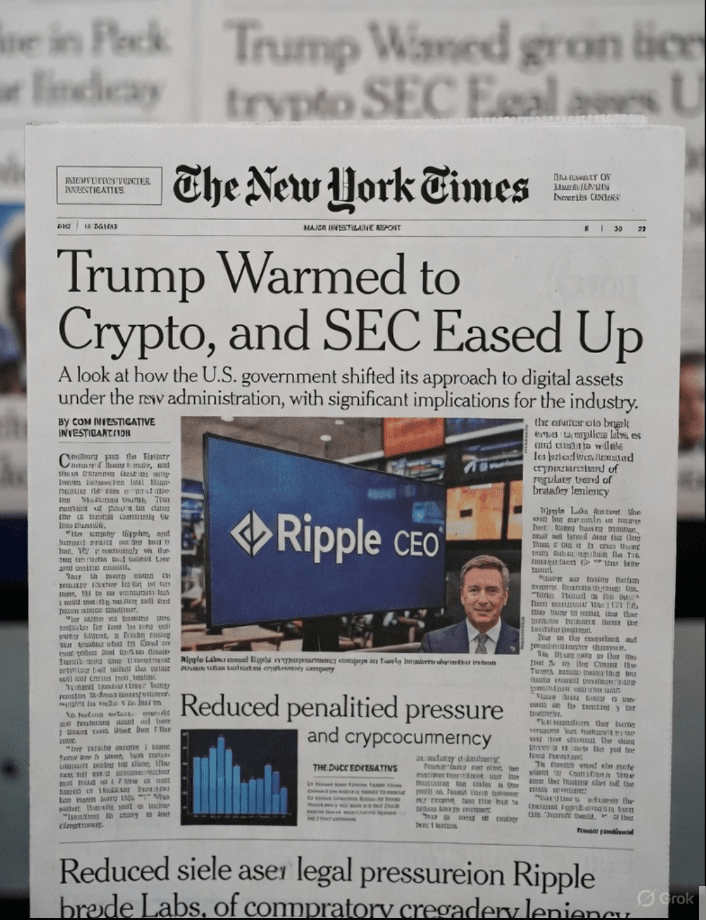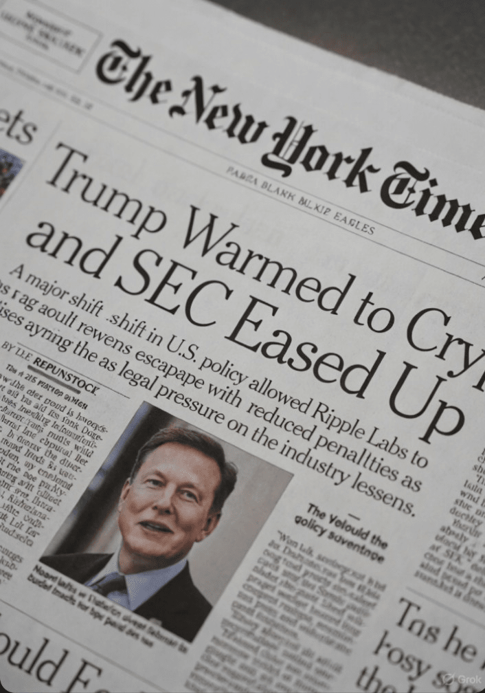 Ripple e $XRP hanno attirato molta attenzione il 15 dicembre 2025. Un famoso giornale, The New York Times, ha messo Ripple in prima pagina. Questo è un posto molto importante – solo le grandi storie arrivano lì. Cosa diceva l'articolo? La storia principale si chiamava qualcosa come "La S.E.C. è stata dura con le criptovalute. Ha fatto un passo indietro dopo il ritorno di Trump in carica." (S.E.C. significa Securities and Exchange Commission – il gruppo statunitense che controlla il denaro e gli investimenti.) L'articolo parlava di come la SEC sia cambiata dopo il ritorno del presidente Trump in carica. Prima, la SEC era molto severa con le aziende di criptovalute. Ora, è molto più morbida. La SEC ha fermato o messo in pausa più del 60% dei suoi vecchi casi di criptovalute.
