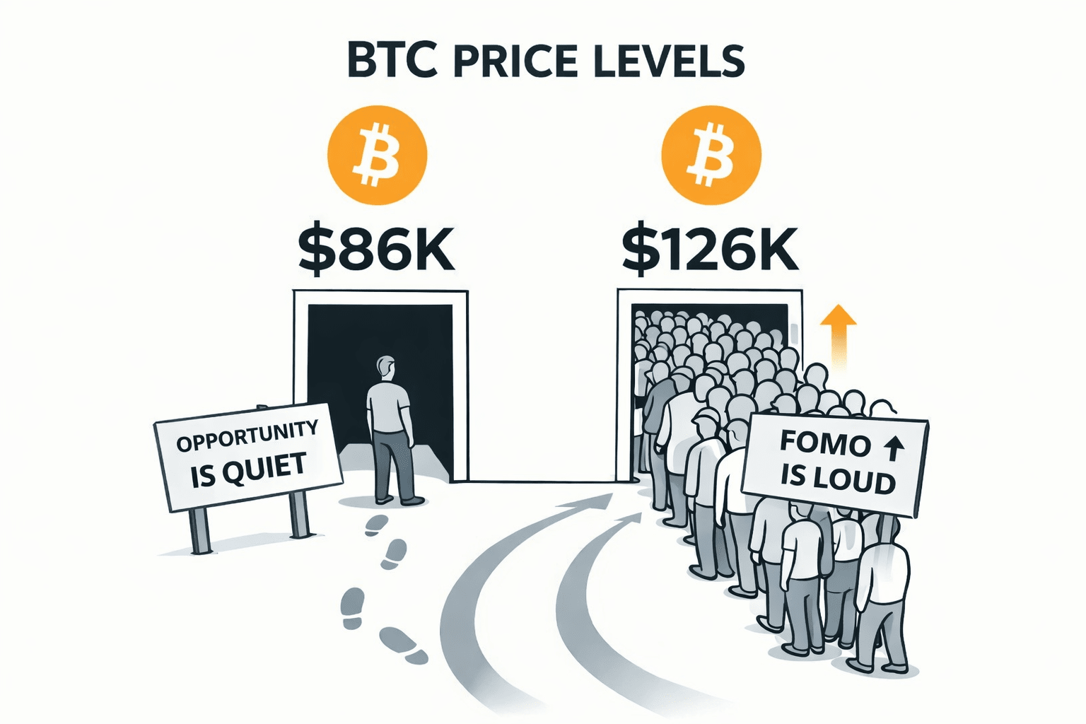 Ma quando $BTC BTC inizia a decollare e i titoli urlano nuovi massimi, la folla si precipita. La paura di perdere sostituisce la paura di perdere. Le persone che hanno ignorato Bitcoin a $86K si sentono improvvisamente costrette a comprare a $126K — non perché i fondamentali siano cambiati, ma perché le emozioni lo sono.